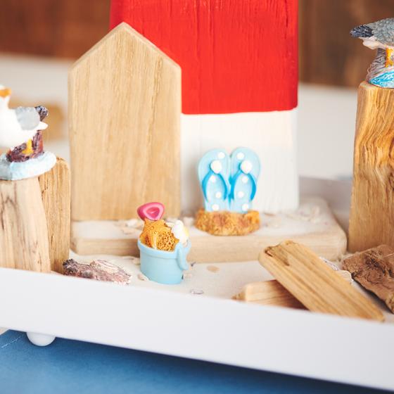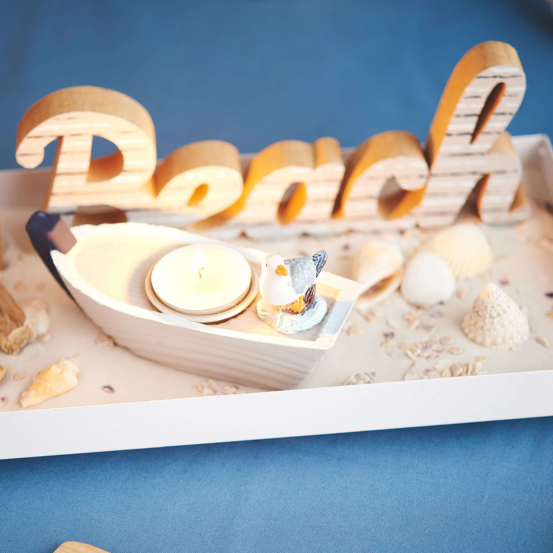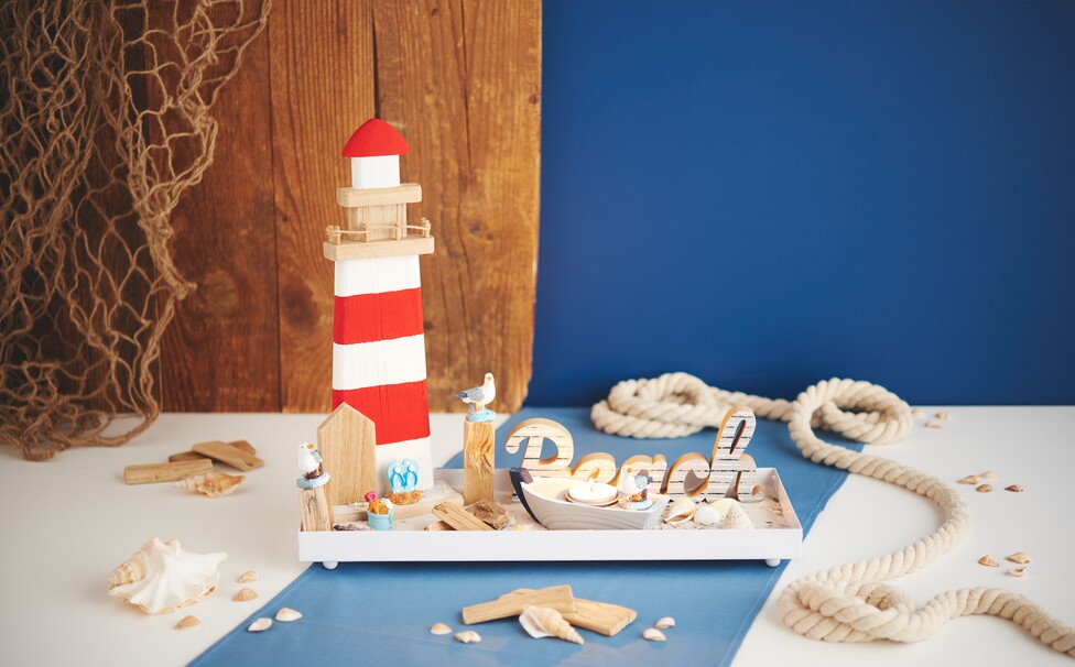 Platziere alle dekorierten Elemente auf deinem Tablett. Überlege dir eine Anordnung, die dir am besten gefällt. Du kannst den Leuchtturm und das Teelicht weiter nach vorne oder seitlich stellen, damit alles gut zur Geltung kommt.