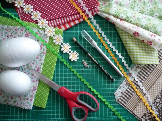 Danach müsst ihr den Stoff für die Ostereier in kleine Stücke zuschneiden - diese sollten etwas größer sein als das Muster auf dem Styroporei.