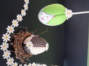 Nun könnt ihr mit Bändern oder kleinen Streuteilen das Osterei noch ein wenig interessanter machen. Diese befestigt ihr mit kleinen Stecknadeln oder mit Hilfe einer Heißklebepistole.