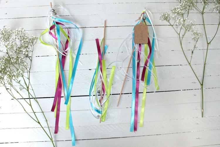Tipp: Variiere ruhig mit den Längen der Bänder. Sie dürfen auch länger als die Stäbe selber sein, damit man auch ordentlich jubeln kann.