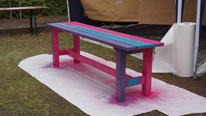 Wir haben die Holzbank in den VBS-Farben lackiert und den Namen mit Hilfe einer Schablone auf ihr verewigt. Die Gestaltungsmöglichkeiten mit dem edding Permanent Spray sind nahezu unerschöpflich. Nun steht die Bank an der Haltestelle vor dem Bastelmarkt hier in Verden und bietet jedem Wartendem ein gemütliches Plätzchen.