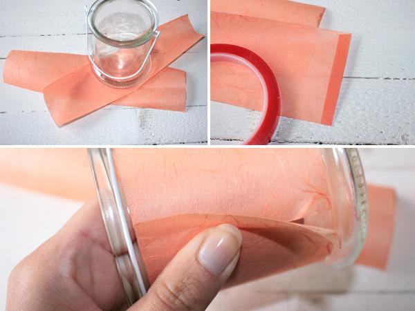 Am Ende des Rechtecks fügt ihr dann das doppelseitige Klebeband an. Legt die Banderole um das Glas und zieht sie möglichst stramm. Haltet die Strohseide gut fest, löst die Schutzfolie von dem Klebeband und klebt die Banderole zusammen. Dazu einfach mit dem Finger zum Rand hin fest streichen. Wem das zu rutschig ist, der kann die Banderole aber auch direkt auf dem Glas mit dem Klebeband befestigen.