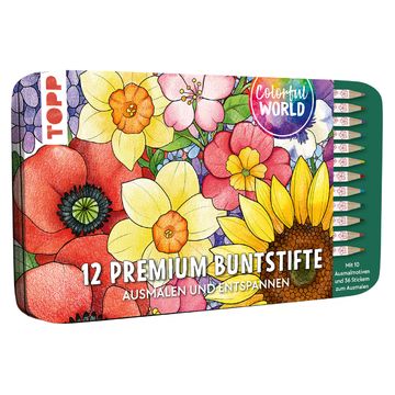 • Untertitel: 12 Premium Buntstifte mit weichen Minen, 10 Ausmalbilder und 36 Ausmalsticker in Designdose