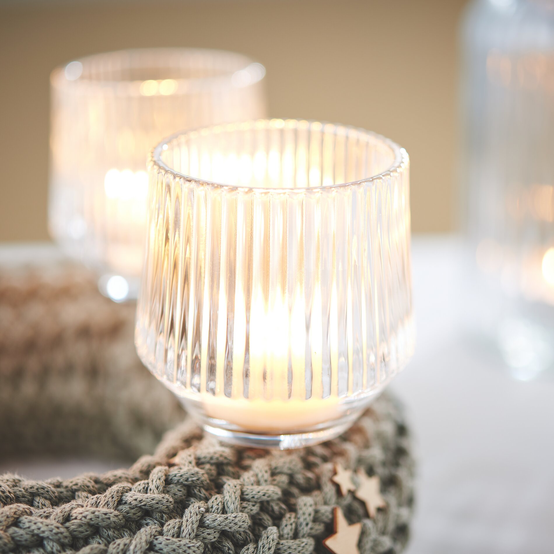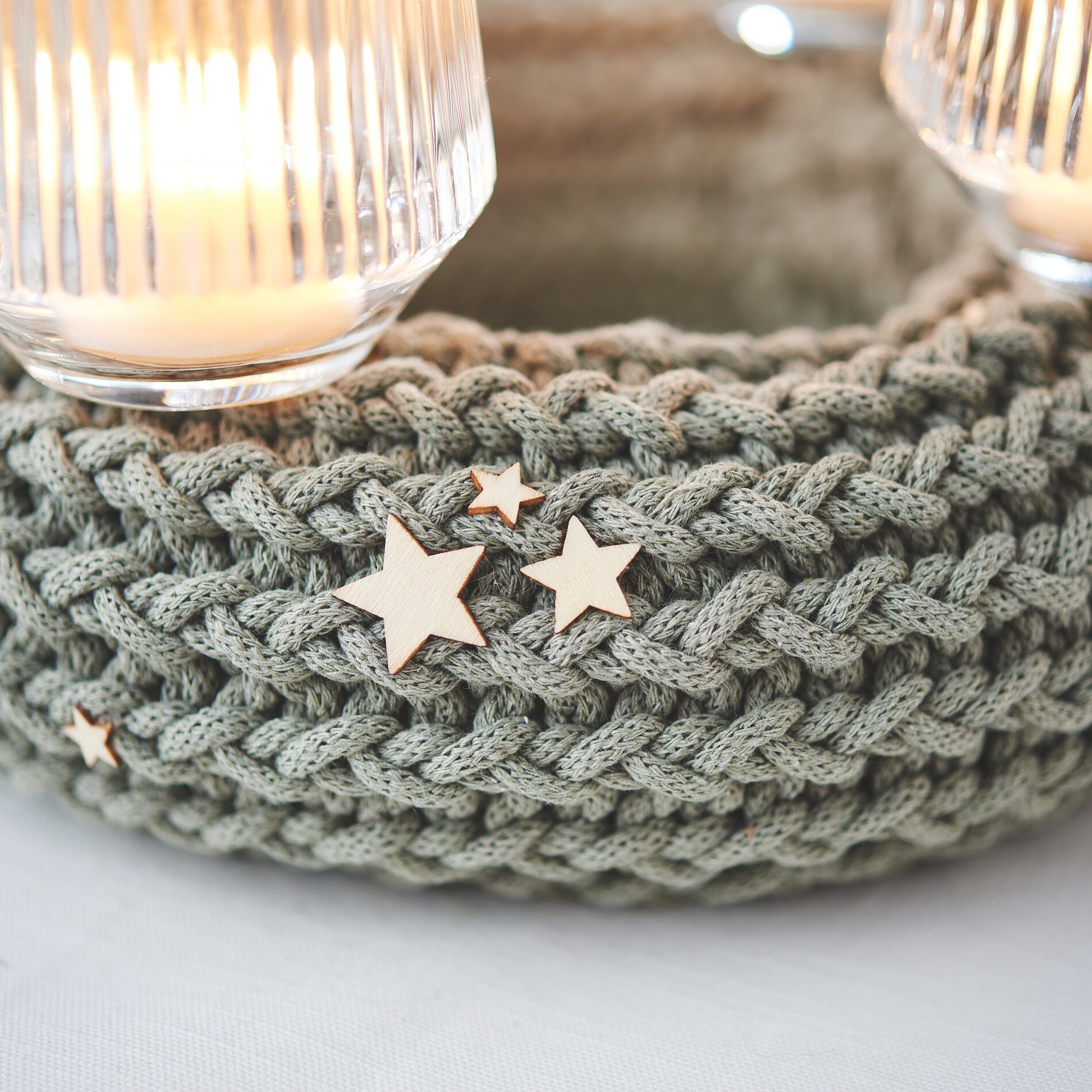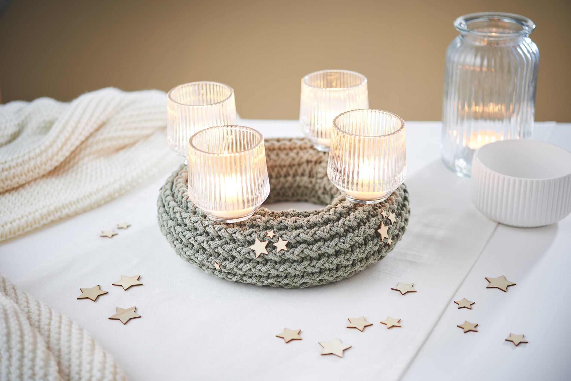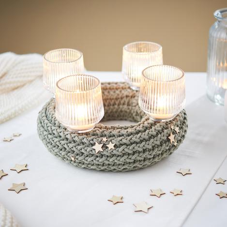 Finally, you can place the glass candle holders on the knitted wreath and insert the tea lights. Then glue a few wooden stars onto the wreath using hot glue.