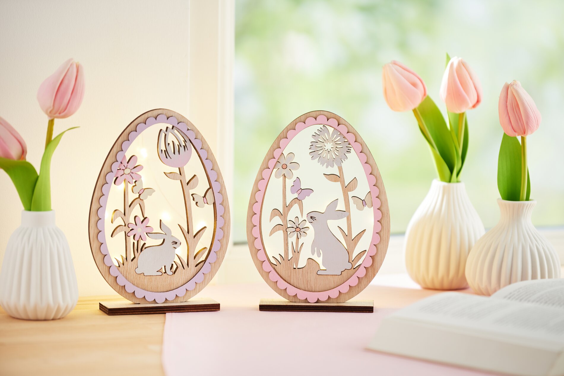 For atmospheric, indirect lighting, attach a small chain of light behind the display stands. You can also use hot glue here, but be careful not to damage the chain of light . Once all the elements are securely attached and the glue is completely dry, you can place the illuminated decorative egg-standing decoration as you wish.