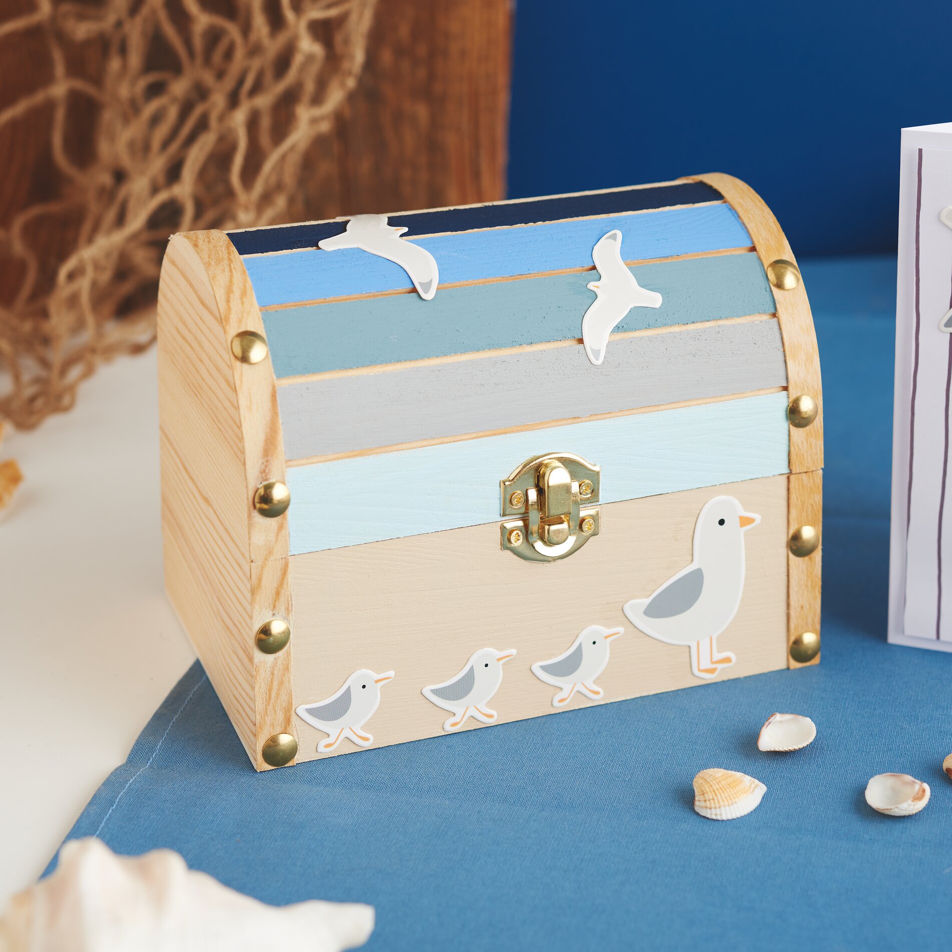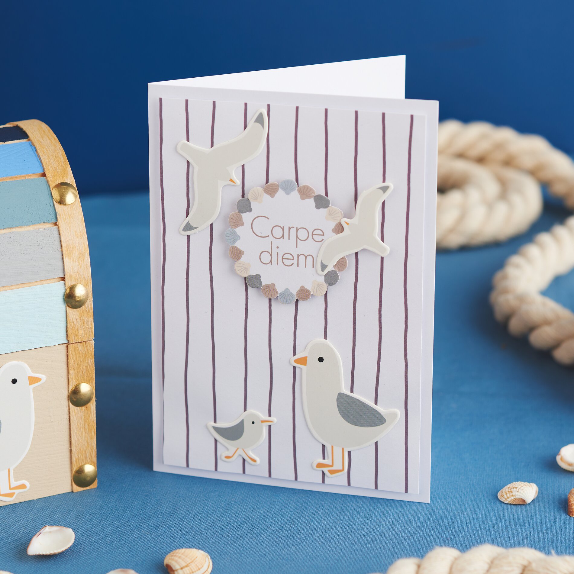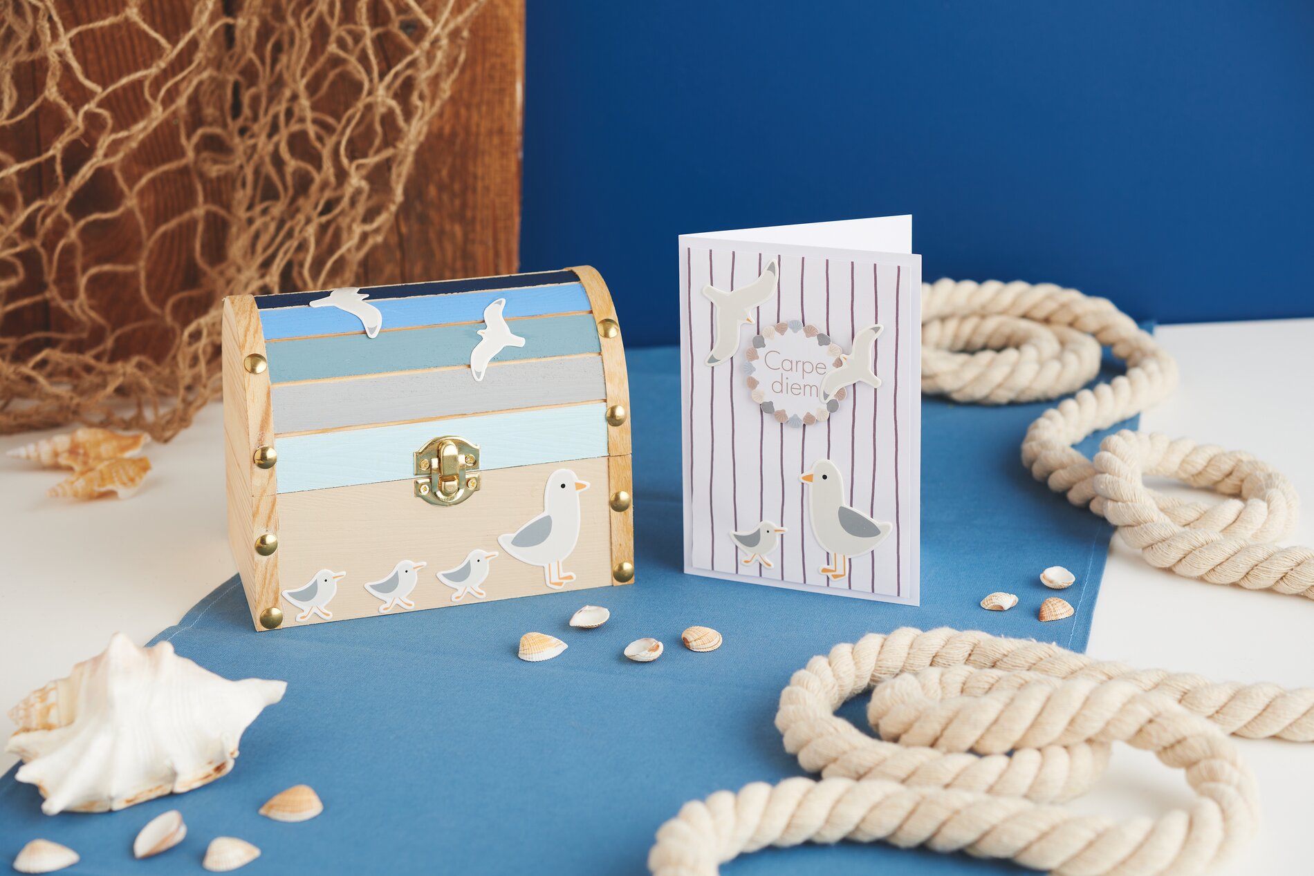 With this inspirational idea, you can create a wooden round-lidded chest and a matching card with a harmonious maritime look. Ideal as a gift, for storing small treasures or as a lovely DIY-Project for in between. The combination of craft colors, paper shapes and 3D effects creates depth and an individual style - perfect for anyone who loves creative crafting and design.