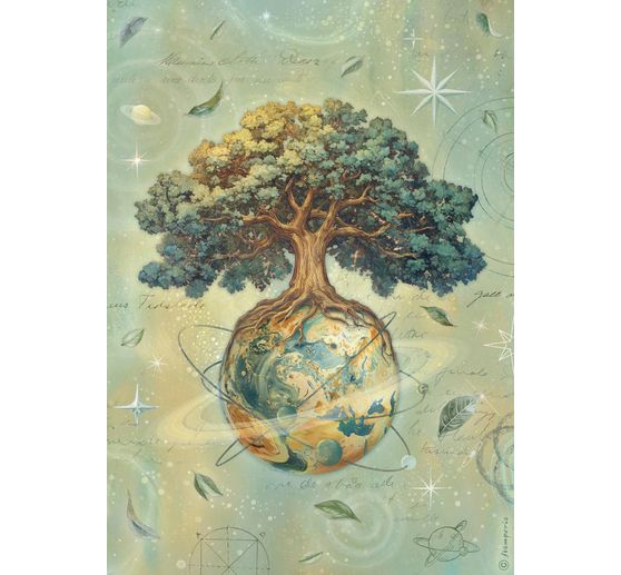 Discover the magic of a new beginning with the Motif straw silk "A New Beginning - The World Tree". This inspiring design shows a mighty tree enthroned on a globe, surrounded by a universe of leaves, stars and planets. Let your creativity run wild and create unique works of art with this versatile natural paper.