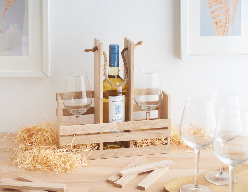 Are you looking for a unique DIY project that will not only boost your creativity, but will also be indispensable at your next picnic? Then I've got just the thing for you! These craft instructions will show you how to make a stylish wine carrier with space for glasses from simple wooden cubes. This homemade wine carrier is guaranteed to turn heads and is also ideal as a personalised gift. What are you waiting for? Let's get to work and bring your DIY skills to life!
