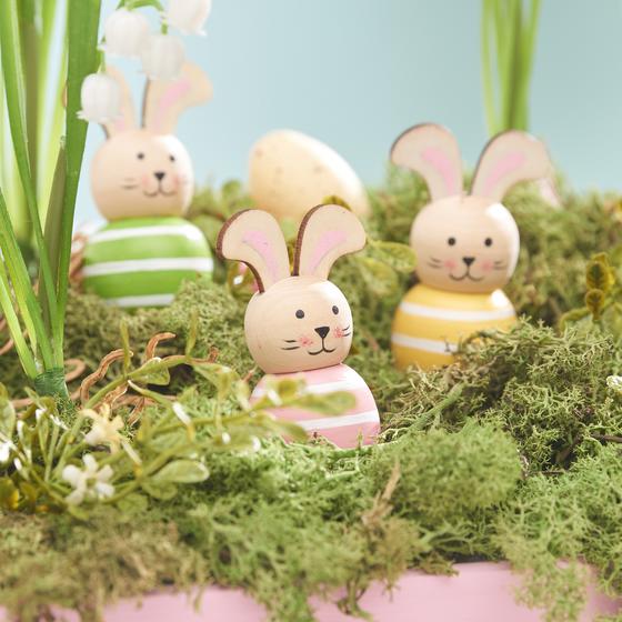 3. Österlich verzieren Setze kleine Ostereier und Häschen in das Gesteck. Damit alles gut hält, fixiere sie und einzelne kleine Blüten mit etwas Heißkleber.