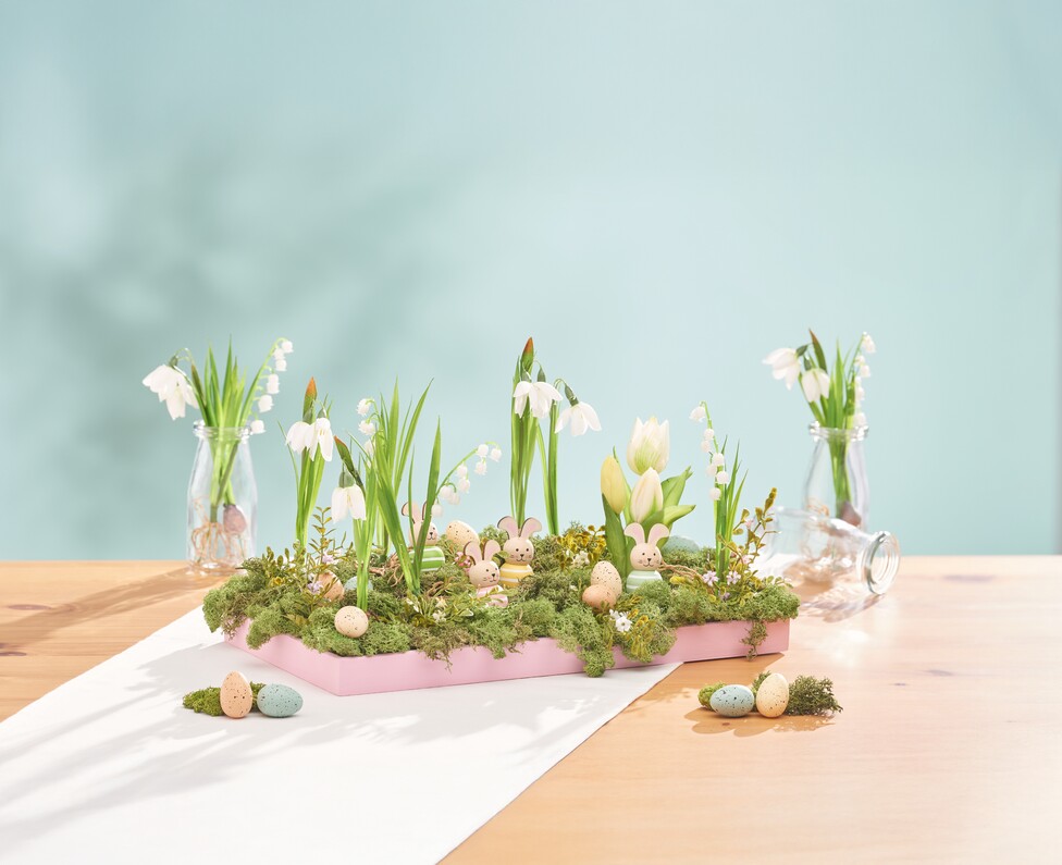 2. Gesteck fertigen Wenn die Farbe getrocknet ist, belege die Innenfläche des Tabletts mit Steckschaum:. Fixiere ihn mit etwas Heißkleber und drücke ihn fest auf die Fläche. Belege den Steckschaum mit Moos, sodass dieses vollständig bedeckt ist. Arrangiere nun Maiglöckchen, Blüten-Pick, Tulpen und Schneeglöckchen in deinem Gesteck: die Kunstblumen einfach an der gewünschten Position in den Steckschaum stecken, eventuell vorab etwas auf die perfekte Länge zuschneiden. Du erhältst ein lebendiges und dynamisches Arrangement, wenn du die Blumen dabei in unterschiedlichen Höhen und Farben miteinander variierst.