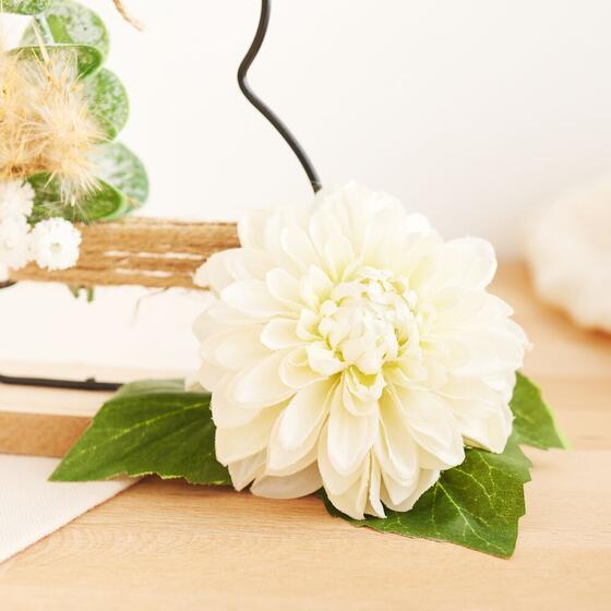 Stecke die Pflanzen dekorativ in das Juteband. Teste verschiedene Anordnungen, bis du ein harmonisches Gesamtbild erzielt hast. Auch sie können mit einigen versteckt platzierten Tropfen Heißkleber fixiert werden. Wenn gewünscht, arrangiere als I-Tüpfelchen eine einzelne größere Blüte an deiner neuen Osterdekoration.