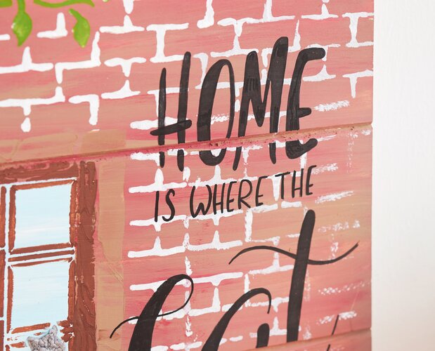 Lasse alle Farben gut durchtrocknen – danach ist dein kreatives Holzprojekt abgeschlossen. Die Kombination aus bemalter Fläche, Schablonenmotiv, plastischer Strukturfarbe und feinen Markerlinien macht deine Holzplatte zu einem einzigartigen Dekostück mit handgemachtem Charakter.