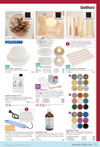 NEUSilikon-Gie%u00dfform TeelichthalterRund%u00d8 8,5 x H 2 cm41279 157,49Quadratisch7,5 x 7,5 x 2 cm41279 167,49Stern11,5 x 11 x 2 cm41279 177,49NEUSilikon-Gie%u00dfform \Bestehend aus zwei Teilen. F%u00fcllmenge ca. 400 ml.41279 2011,99Epoxidharz transparent, 400 mlF%u00fcr Schmuck, Dekorationen u.v.m. Trocknet nach ca. 36 Stunden zu einer widerstandsf%u00e4higen, glasartigen Oberfl %u00e4che. Inhalt: 200 ml Epoxidharz und 200 ml H%u00e4rter.41279 1429,991kg=74,97Achtung H315, H317, H319, H335, H411BESTSELLERCrystal-Gie%u00dfharz, 8-tlg.Transparentes Gie%u00dfharz. F%u00fcr Einschlussarbeiten und Lasuren. Harz und H%u00e4rter im Verh%u00e4ltnis 2:1 mischen. Trocknungszeit ca. 24 Std. Inhalt: Je 100 g bzw. 200 g bzw. 500 g Gie%u00dfharz, 50 g bzw. 100 g bzw. 250 g Crystal H%u00e4rter, 2 Messbecher, 2 R%u00fchrspatel, 1 Paar Einmalhandschuhe. Inkl. Anleitung.150 ml41488 662 0126,99300 ml41488 662 0234,99750 ml41488 662 0349,99Gefahr H302, H314, H315, H317, H319, H411, H412NEUVBS Silikon Gie%u00dfform \Zum Gie%u00dfen von 4 Kl%u00f6tzchen von je ca. 160 x 22 x 8 mm.41282 434,79BEWERTUNGxxxxxEmbossing-TrocknerHandliches und leichtes Hei%u00dfluftger%u00e4t zum schnellen und einfachen Schmelzen von Embossing-Einbrennpulver. Mit Halterung zum Aufstellen. Inkl. Anleitung. L ca. 24 cm. 220V/300W. Warnung: Dies ist kein Spielzeug. Nicht geeignet f%u00fcr Kinder unter 3 Jahren.41552 89921,99Harz-Entferner, 100 mlReinigungsmittel mit einer hohen L%u00f6sekraft. Entfernt m%u00fchelos nicht ausgeh%u00e4rtete Harzreste oder R%u00fcckst%u00e4nde von Polyester, Epoxydharz und Kaltglasur von H%u00e4nden, Kleidung und Arbeitsger%u00e4ten.41247 435,49F%u00fcllzubeh%u00f6rset, 9 TiegelInhalt: 9 Tiegel mit Schraubverschl%u00fcssen. Kompatibel mit allen Harzarten, von UV- bis Epoxidharz. Eignet sich f%u00fcr die Verwendung mit Silikonformen. A. Gold Silber Partikelmix41261 048,49B. Glitzerpulver41261 018,49C. Glimmerpuder41261 038,49| 11www.vbs-hobby.comErl%u00e4uterungen zu Icons und Artikeleigenschaften auf S. 57Gie%u00dfharz ADekobeispielDekobeispielDekobeispielZAPFEN AUF S. 13 Um Luftblasen zu entfernen und eine klare Oberfl %u00e4che zu erreichen, geh mit einem Embossing Trockner langsam %u00fcber die Oberfl %u00e4che, bis sich alle Bl%u00e4schen aufgel%u00f6st haben und das Harz glasklar wirkt.BCAnleitung3500Anleitung3499Anleitung3496Das Windlicht besteht aus einer Kombination von insgesamt 12 gegossenen Bastelkl%u00f6tzchen: 8 wurden mit einer wei%u00dfen Gie%u00dfmasse von S. 9 hergestellt, 4 weitere mit Gie%u00dfharz.