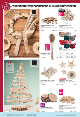 Dekobeispiel12 |Alle Preise in %u20ac inkl. gesetzl. MwSt.Deutschland: 04231 668 11 (Mo.-Fr. 9-17 Uhr)%u00d6sterreich: 01 662 20 20 (Mo.-Fr. 9-17 Uhr)**service@vbs-hobby.comservice@vbs-hobby.at**Es entstehen Ihnen normale Verbindungskosten nach Wien.VBS Streuteile \272er-Set%u00d8 ca. 1 cm, 1,5 cm und 2 cm, St%u00e4rke ca. 1,5 mm. Aus unbehandeltem Sperrholz.41180 315,49b272er-Setnur549VBS Rindenscheiben-Mix \ca. 250 gGr%u00f6%u00dfe ca. 2,5%u20135,5 cm. St%u00e4rke ca. 6%u20138 mm. Aus Rindenholz.41206 573,991kg=15,96NEUBaumwollkordel, 2er-SetL%u00e4nge ca. 15 m, St%u00e4rke ca. 2 mm. Aus 100 % Baumwolle.A. Natur41282 353,991m=0,13B. Tannengr%u00fcn41282 363,991m=0,13C. Rot41282 373,991m=0,13D. X-Mas41282 383,991m=0,13Pampasgras, 10 Stiele L ca. 80 cm. Aus Naturmaterial.41134 585,9910 Stielenur599VBS Birken%u00e4ste \%u00d8 ca. 1,6-2,5 cm, L ca. 25 cm. Aus Birkenholz.41619 3879,99ymit MagnetStreuteile Stern \Mit Magnet, %u00d8 ca. 9,7 / 5 / 6 cm, St%u00e4rke ca. 3 mm. Aus Holz.41154 262,49BESTSELLERVBS Baumscheiben, 4 St%u00fcck%u00d8 ca. 10-16 cm, St%u00e4rke ca. 2 cm. Aus Pinienholz.41616 73712,99VBS Birkenscheiben-Mix \ca. 250 gGr%u00f6%u00dfe ca. 6-10 cm. St%u00e4rke ca. 5-8 mm. Aus Naturmaterial, kann in der Gr%u00f6%u00dfe und Farbe abweichen.41206 553,991kg=15,96250 gnur399 Zauberhafte Weihnachtsdeko aus Naturmaterialien DekobeispielAnleitung3501Anleitung3510AF%u00fcr den Weihnachtsbaum wurden die VBS Rundst%u00e4be und Holzkugeln von S. 13 verwendet.BCDNEUBaumwollkordel, 2er-SetL%u00e4nge ca. 15 m, St%u00e4rke ca. 2 mm. Aus 100 % Baumwolle.Pampasgras, 10 Stiele L ca. 80 cm. Aus Natur10 Stielenur599C