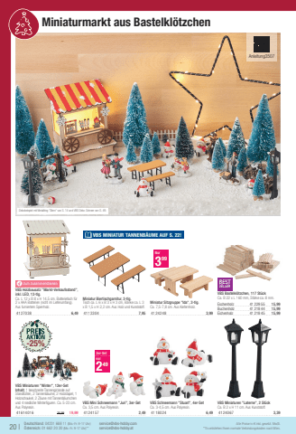 Dekobeispiel mit Metallring \20 |Alle Preise in %u20ac inkl. gesetzl. MwSt.Deutschland: 04231 668 11 (Mo.-Fr. 9-17 Uhr)%u00d6sterreich: 01 662 20 20 (Mo.-Fr. 9-17 Uhr)**service@vbs-hobby.comservice@vbs-hobby.at**Es entstehen Ihnen normale Verbindungskosten nach Wien. Miniaturmarkt aus Bastelkl%u00f6tzchen yZum ZusammensteckenVBS Holzbausatz \inkl. LED, 13-tlg.Ca. L 12 x B 8 x H 14,5 cm. Batteriefach f%u00fcr 2 x AAA Batterien (nicht im Lieferumfang). Aus furniertem Sperrholz.41270 386,49BESTSELLERVBS Bastelkl%u00f6tzchen, 117 St%u00fcckCa. B 22 x L 160 mm, St%u00e4rke ca. 8 mm.Eschenholz41229 5515,99Buchenholz41218 4415,99Eichenholz41218 4515,99Miniatur Biertischgarnitur, 3-tlg.Tisch ca. L 6 x B 3 x H 3 cm, B%u00e4nke ca. L 3 x B 1,5 x H 2,2 cm. Aus Holz und Kunststoff.41133 047,95VBS Miniaturen \Ca. B 2 x H 11 cm. Aus Kunststoff.41240 673,39VBS Miniaturen \Inhalt: 1 beschneite Tannengirlande auf Standf%u00fc%u00dfen, 2 Tannenb%u00e4ume, 2 Holzstapel, 1 Holzschaukel, 2 Z%u00e4une mit Tannenb%u00e4umchen und 4 niedliche Winterfi guren. Ca. 5-23 cm. Aus Polyresin.41614 01626,9919,99VBS Mini Schneemann \Ca. 3,5 cm. Aus Polyresin.41241 572,493er-Setnur249Miniatur Sitzgruppe \Ca. 7,5-7,8 cm. Aus Kiefernholz.41242 483,99Nur399Anleitung3507-25%VBS MINIATUR TANNENB%u00c4UME AUF S. 22! VBS Schneemann \Ca. 3-4,5 cm. Aus Polyresin.41180 246,49