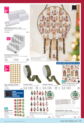 VBS Streichholzschachteln, Wei%u00dfOhne Z%u00fcndh%u00f6lzer. Ca. L 5 x B 3,5 x H 1,5 cm. Aus wei%u00dfem, unbedruckten Karton.10 Stk.41720 4102,69100 Stk.41722 47613,99*Beim Kauf von 100 St%u00fcck gegen%u00fcber dem Kauf von 10 St%u00fcckVBS Streichholzschachteln XL, 12 St%u00fcckOhne Z%u00fcndh%u00f6lzer. Ca. L 11 x B 6 x H 2 cm. Aus wei%u00dfem, unbedrucktem Karton.41706 8036,5947%*sparen12 St%u00fccknur659| 29www.vbs-hobby.comErl%u00e4uterungen zu Icons und Artikeleigenschaften auf S. 57Dekobeispiel mit Metallring %u00d8 45 cm von S. 15, VBS Juteband mit Drahtkanten von S. 12 und VBS Deko-Schnee Liner von S. 49Sticker \4 Bogen mit je 50 Stickern. %u00d8 ca. 1 cm. Aus Papier.41138 053,29200 St%u00fccknur329Druckband \B ca. 25 mm, L ca. 6 m. Aus Polyester.ab 1 Stk.41264 595,991m=1,00ab 6 Stk.41264 594,791m=0,80Druckband \B ca. 15 mm, L ca. 8 m. Aus Polyester.ab 1 Stk.41264 615,691m=0,71ab 6 Stk.41264 614,551m=0,57NEUServiette \Ca. 33 x 33 cm. Die Serviette ist in vier gleiche Motive aufgeteilt. Aus Papier.ab 1 Stk.41288 163,60ab 4 Stk.41288 162,88NEUVBS Adventszahlen, 24er-SetMit Klebepunkt auf der R%u00fcckseite. H ca. 4 cm. Aus Filz.41240 823,99VBS Adventszahlen \Klammern ca.%u00a0L 4,8 x B 0,7 cm, Motivgr%u00f6%u00dfe ca. 3,5-4 cm. Aus Holz.41154 798,997,19VBS Adventsschilder \Die Zahlen k%u00f6nnen auf die Schilder aufgeklebt werden. Schilder ca. 6 x 3,5 cm, mit %u00d6se von %u00d8 ca. 2 mm, Zahlen ca. H 2 x B 0,7-2,3 cm, St%u00e4rke jeweils ca. 1,5 mm. Aus Sperrholz, einseitig wei%u00df grundiert.41180 355,994,99-20%-16%VBS SERVIETTENLACK AUF S. 35 Anleitung3498 MEHRADVENTSZAHLENONLINEENTDECKEN