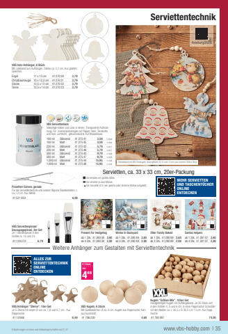 VBS Holz-Anh%u00e4nger, 8 St%u00fcckMit Juteband zum Aufh%u00e4ngen. St%u00e4rke ca. 0,2 cm. Aus glattem Sperrholz.Engel11 x 13 cm41270 303,79Christbaumkugel10 x 12,3 cm41270 313,79Glocke12,5 x 12 cm41270 323,79Tanne12,5 x 14 cm41270 333,79VBS ServiettenlackVielseitige Kleber und Lack in einem. Transparente Auftrocknung. F%u00fcr Innenanwendungen auf Pappe, Stein, Terrakotta und Holz. Lichtecht, geruchsneutral. Auf Wasserbasis.100 mlGl%u00e4nzend41275 413,591l=35,90100 mlMatt41275 453,591l=35,90230 mlGl%u00e4nzend41275 425,791l=25,17230 mlMatt41275 465,791l=25,17500 mlGl%u00e4nzend41275 439,791l=19,58500 mlMatt41275 479,791l=19,581.000 mlGl%u00e4nzend41275 4415,951l=15,951.000 mlMatt41275 4815,951l=15,95VBS Serviettenpinsel/Decoupagepinsel, 3er-SetJe 1 Borstenpinsel in den Gr%u00f6%u00dfen 6, 16 und 24.41120 2726,79VBS Anh%u00e4nger \Je 5 Sterne mit einem %u00d8 von ca. 7,8 und 9,7 cm. Aus Pappmach%u00e9.41120 688,49VBS Kugeln, 6 St%u00fcckMit Goldb%u00e4ndchen. %u00d8 ca. 6 cm. Kugeln aus Pappmach%u00e9, Kern aus Kunststoff.41706 2304,69Kugeln \Handgefertigte Kugeln mit Aufh%u00e4ngeband. Je 35 St%u00fcck sort. in den Gr%u00f6%u00dfen 4, 5 und 6 cm. In einer Pappmach%u00e9-Schachtel mit den Ma%u00dfen ca. L 36,5 x B 36,5 x H 13 cm. Aus Pappmach%u00e9.41792 09774,006 St%u00fccknur469| 35www.vbs-hobby.comErl%u00e4uterungen zu Icons und Artikeleigenschaften auf S. 57Pinzetten-Schere, geradeF%u00fcr die Serviettentechnik und andere fi ligrane Bastelarbeiten. L ca. 12 cm. Aus Metall.41521 9326,99Present For Hedgehogab 1 Stk.41280 593,60ab 4 Stk.41280 592,88Winter In Backyardab 1 Stk.41280 493,60ab 4 Stk.41280 492,88Otter Family Bakedab 1 Stk.41280 893,60ab 4 Stk.41280 892,88Santas Helpersab 1 Stk.41281 073,60ab 4 Stk.41281 072,88Servietten, ca. 33 x 33 cm, 20er-PackungSie erhalten je zwei Motive.Sie erhalten ein gro%u00dfes Motiv.Die Serviette ist in vier gleiche oder %u00e4hnliche Motive aufgeteilt.Dekobeispiel mit VBS Holzkugeln, durchgebohrt, %u00d8 10 und 15 mm aus unserem Online-Shop Weitere Anh%u00e4nger zum Gestalten mit Serviettentechnik MEHR SERVIETTENUND TASCHENT%u00dcCHERONLINEENTDECKEN Serviettentechnik Anleitung3529 ALLES ZURSERVIETTENTECHNIKONLINEENTDECKEN