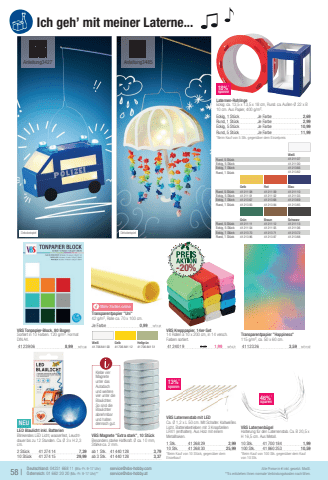 Laternen-RohlingeEckig: ca. 13,5 x 13,5 x 18 cm, Rund: ca. Au%u00dfen-%u00d8 22 x B 10 cm. Aus Papier, 400 g/m%u00b2.Eckig, 1 St%u00fcckJe Farbe2,69Rund, 1 St%u00fcckJe Farbe2,99Eckig, 5 St%u00fcckJe Farbe10,99Rund, 5 St%u00fcckJe Farbe11,99*Beim Kauf von 5 Stk. gegen%u00fcber dem Einzelpreis18%*sparen58 |Alle Preise in %u20ac inkl. gesetzl. MwSt.Deutschland: 04231 668 11 (Mo.-Fr. 9-17 Uhr)%u00d6sterreich: 01 662 20 20 (Mo.-Fr. 9-17 Uhr)**service@vbs-hobby.comservice@vbs-hobby.at**Es entstehen Ihnen normale Verbindungskosten nach Wien.VBS Tonpapier-Block, 80 BogenSortiert in 10 Farben. 120 g/m%u00b2. Format DIN A4.41239 068,991m%u00b2=1,44yMehr Farben onlineTransparentpapier \42 g/m%u00b2, Rolle ca. 70 x 100 cm.Je Farbe0,991m%u00b2=1,41VBS Krepppapier, 14er-Set14 Rollen %u00e0 10 x 200 cm, in 14 versch. Farben sortiert.41240 192,491,991m%u00b2=0,71Transparentpapier \115 g/m%u00b2, ca. 50 x 60 cm.41123 263,591m%u00b2=11,97NEULED Blaulicht inkl. BatterienBlinkendes LED Licht, wasserfest, Leuchtdauer bis zu 12 Stunden. Ca. %u00d8 3 x H 2,3 cm.2 St%u00fcck41274 147,3910 St%u00fcck41274 1529,99VBS Magnete \Besonders starke Haftkraft. %u00d8 ca. 10 mm, St%u00e4rke ca. 2 mm.ab 1 Stk.41440 1283,79ab 3 Stk.41440 1283,37VBS Laternenstab mit LEDCa. %u00d8 1,2 x L 50 cm. Mit Schalter. Kaltwei%u00dfes Licht. Batteriebetrieben mit 3 Knopfzellen LR41 (enthalten). Aus Holz mit einem Metallhaken.1 Stk.41268 292,9910 Stk.41268 3025,99*Beim Kauf von 10 St%u00fcck, gegen%u00fcber dem EinzelkaufVBS Laternenb%u00fcgelHalterung f%u00fcr den Laternenstab. Ca. B 20,5 x H 16,5 cm. Aus Metall.10 Stk.41700 1841,99100 Stk.41860 25310,59*Beim Kauf von 100 Stk. gegen%u00fcber dem Kauf von 10 Stk.DekobeispielDekobeispiel Ich geh%u2019 mit meiner Laterne... Wei%u00dfGelbHellgr%u00fcn41706 841 0041706 841 1241706 841 51-20%Anleitung3427Anleitung348546%*sparen13%*sparenKlebe vier Magnete unter das Autodach und weitere vier unter die Blaulichter. So sind die Blaulichter abnehmbar und halten dennoch gut.Wei%u00dfRund, 5 St%u00fcck41211 07Eckig, 5 St%u00fcck41211 00Eckig, 1 St%u00fcck41213 66Rund, 1 St%u00fcck41213 82GelbRotBlauRund, 5 St%u00fcck41211 0841211 0941211 10Eckig, 5 St%u00fcck41211 0141211 0241211 03Eckig, 1 St%u00fcck41213 6741213 6841213 69Rund, 1 St%u00fcck41213 8341213 8441213 85Gr%u00fcnBraunSchwarzRund, 5 St%u00fcck41211 1141211 1241211 13Eckig, 5 St%u00fcck41211 0441211 0541211 06Eckig, 1 St%u00fcck41213 7041213 7141213 72Rund, 1 St%u00fcck41213 8641213 8741213 88