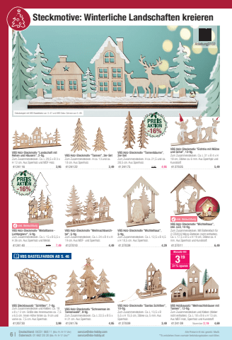 Dekobeispiel mit VBS Bastelfarbe von S. 47 und VBS Deko-Schnee von S. 49.6 |Alle Preise in %u20ac inkl. gesetzl. MwSt.Deutschland: 04231 668 11 (Mo.-Fr. 9-17 Uhr)%u00d6sterreich: 01 662 20 20 (Mo.-Fr. 9-17 Uhr)**service@vbs-hobby.comservice@vbs-hobby.at**Es entstehen Ihnen normale Verbindungskosten nach Wien.VBS Holz-Steckmotiv \Zum Zusammenstecken. H ca. 13 und ca. 18 cm. Aus Sperrholz.41241 223,49VBS Holz-Steckmotiv \10-tlg.Zum Zusammenstecken. Ca. L 13,5 x B 5,5 x H 15,5 cm, St%u00e4rke ca, 5 mm. Aus Sperrholz.41270 093,49VBS Holz-Steckmotiv \Rehen und H%u00e4usern\Zum Zusammenstecken. Ca. L 29,5 x B 3 x H 12 cm. Aus Sperrholz und MDF-Holz.41241 163,95yinkl. BeleuchtungVBS Holz-Steckmotiv \inkl. LED, 10-tlg.Zum Zusammenstecken. Mit Batteriefach f%u00fcr 2 CR2032 Micro-Batterien (nicht enthalten). Ca. L 17,5 x B 5 x H 19 cm, St%u00e4rke ca. 4 mm. Aus Sperrholz und Kunststoff.41270 116,49VBS Holz-Steckmotiv \5-tlg.Zum Zusammenstecken. Ca. L 12,5 x B 4,5 x H 18,5 cm. Aus Sperrholz.41270 394,29VBS Holz-Steckmotiv \tel\Zum Zusammenstecken. Ca. L 24 x B 4 x H 19 cm. Aus MDF- und Sperrholz.41270 104,49VBS Holz-Steckmotiv \Tannenwald\Zum Zusammenstecken. Ca. L 22,5 x B 5 x H 21 cm. Aus Sperrholz.41241 764,95VBS Steckbausatz \Zum Zusammenstecken und Kleben. Ca. 18 x 8 x 12 cm. Gr%u00f6%u00dfe des Innenraumes ca. 7,5 x 6,5 cm. Innen-H%u00f6he hinten ca. 9 cm und vorne ca. 7,5 cm. Aus Sperrholz.41207 303,99Anleitung3102VBS Holz-Steckmotiv %und Schal\Zum Zusammenstecken. Ca. L 31 x B 4 x H 18 cm, St%u00e4rke ca. 6 mm. Aus Sperrhplz und Kunststoff.41270 255,49VBS Holzbausatz \Tannen\Zum Zusammenstecken und Kleben (Kleber nicht enthalten). Ca. L 18 x B 6 x H 13 cm. Aus MDF-Holz, Sperrholz und Kunststoff.41241 09November 3,194,69Monats-Hit31931 % sparenVBS Holz-Steckmotiv \2er-SetZum Zusammenstecken. H ca. 21,5 und ca. 28,5%u00a0cm. Aus Sperrholz.41241 755,954,95-16%-16% VBS BASTELFARBEN AB S. 46 Steckmotive: Winterliche Landschaften kreieren yinkl. BeleuchtungVBS Holz-Steckmotiv \Lichterglanz\Zum Zusammenstecken. Ca. L 15 x B 5,5 x H 26 cm. Aus Sperrholz und Metall.41241 408,997,49