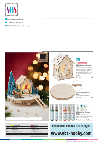 www.vbs-hobby.comKostenlose Ideen & AnleitungenKein Mindestbestellwert1 Monat R%u00fcckgaberechtSicher bezahlen(auch auf Rechnung)Deutschland %u00d6stereichTelefon04231 668 11(Mo.-Fr. 9-17 Uhr)01 662 20 20(Mo.-Fr. 9-17 Uhr)*Fax04231 668 22+49 4231 668 22E-Mailservice@vbs-hobby.comservice@vbs-hobby.atPostJustus-von-Liebig-Str. 8 | 27283 Verden | Deutschland*Es entstehen normale Verbindungskosten nach Wien.NEUymit BeleuchtungVBS Holzbausatz \12-tlg.Zum Zusammenstecken und Kleben (Kleber nicht enthalten). Batteriefach f%u00fcr 2 LR44 Batterien (nicht enthalten). Ca. L 9,8 x B 9,8 x H 13,5 cm.Aus furniertem Sperrholz und Kunststoff.41270 064,99Holz Dekoplatte mit Rinde, auf F%u00fc%u00dfenCa. %u00d8 24 x H 5 cm. Aus Holz.41237 286,99VBS Bastelfarbe \6er-SetInhalt: Je 20 ml in der Farbe Dunkelgr%u00fcn, Braun, Elfenbein, Rot, Gold und Silber. L%u00f6sungsmittelfrei.41275 5613,491l=112,42Anleitung3502Alle Preise in %u20ac inkl. gesetzl. MwSt. Preise g%u00fcltig bis 31.12.2025Dekobeispiel mit VBS Miniatur Leiter \S. 21, VBS Mini Strohkarre von S. 24 und VBS Deko-Schnee von S. 49.