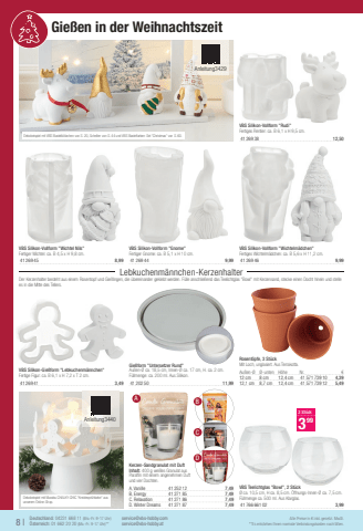 Dekobeispiel mit VBS Bastelkl%u00f6tzchen von S. 20, Schellen von S. 44 und VBS Bastelfarben-Set \s\VBS Silikon-Vollform \Fertiger Wichtel: ca. B 4,5 x H 9,8 cm.41269 458,99VBS Silikon-Vollform \Fertiges Wichtelm%u00e4dchen: ca. B 5,6 x H 11,2 cm.41269 469,99VBS Silikon-Gie%u00dfform \Fertige Figur: ca. B 6,1 x H 7,2 x T 2 cm.41269 413,49Gie%u00dfform \Au%u00dfen-%u00d8 ca. 18,5 cm, Innen-%u00d8 ca. 17 cm, H. ca. 2 cm. F%u00fcllmenge: ca. 200 ml. Aus Silikon.41202 5011,99Rosent%u00f6pfe, 3 St%u00fcckMit Loch, unglasiert. Aus Terrakotta.Au%u00dfen-%u00d8%u00d8-untenH%u00f6heNr.%u20ac12 cm8 cm12,4 cm41571 739 104,3912,1 cm8,7 cm12,4 cm41571 739 125,49VBS Silikon-Vollform \Fertiger Gnome: ca. B 5,1 x H 10 cm.41269 449,99Kerzen-Sandgranulat mit DuftInhalt: 400 g wei%u00dfes Granulat%u00a0aus Paraffi n mit einem angenehmen%u00a0Duft und%u00a0vier Dochten.A. Vanille41252 127,49B. Energy41271 857,49C. Relaxation41271 867,49D. Winter Dreams41271 877,49VBS Teelichtglas \%u00d8 ca. 10,5 cm, H ca. 8,5 cm. %u00d6ffnungs-Innen-%u00d8 ca. 7,5 cm. F%u00fcllmenge ca. 500 ml. Aus Klarglas.41766 661 023,99VBS Silikon-Vollform \Fertiges Rentier: ca. B 6,1 x H 9,5 cm.41269 3812,502 St%u00fcck3998 |Alle Preise in %u20ac inkl. gesetzl. MwSt.Deutschland: 04231 668 11 (Mo.-Fr. 9-17 Uhr)%u00d6sterreich: 01 662 20 20 (Mo.-Fr. 9-17 Uhr)**service@vbs-hobby.comservice@vbs-hobby.at**Es entstehen Ihnen normale Verbindungskosten nach Wien.Dekobeispiel mit Marabu CHALKY-CHIC %unserem Online-Shop.Anleitung3429 Lebkuchenm%u00e4nnchen-Kerzenhalter Gie%u00dfen in der Weihnachtszeit Der Kerzenhalter besteht aus einem Rosentopf und Gie%u00dflingen, die %u00fcbereinander geklebt werden. F%u00fclle anschlie%u00dfend das Teelichtglas \es in die Mitte des Tellers.Anleitung3440ABCD