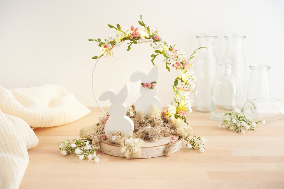 Klebe einen kleinen Blumenkranz an einen der Hasen und befestige beide Hasengießlinge stabil mit Heißkleber auf der Birkenscheibe. Abschließend kannst du Islandmoos und ein paar weitere Blumen auf die Birkenscheibe kleben, um den natürlichen Look des Arrangements zu betonen.