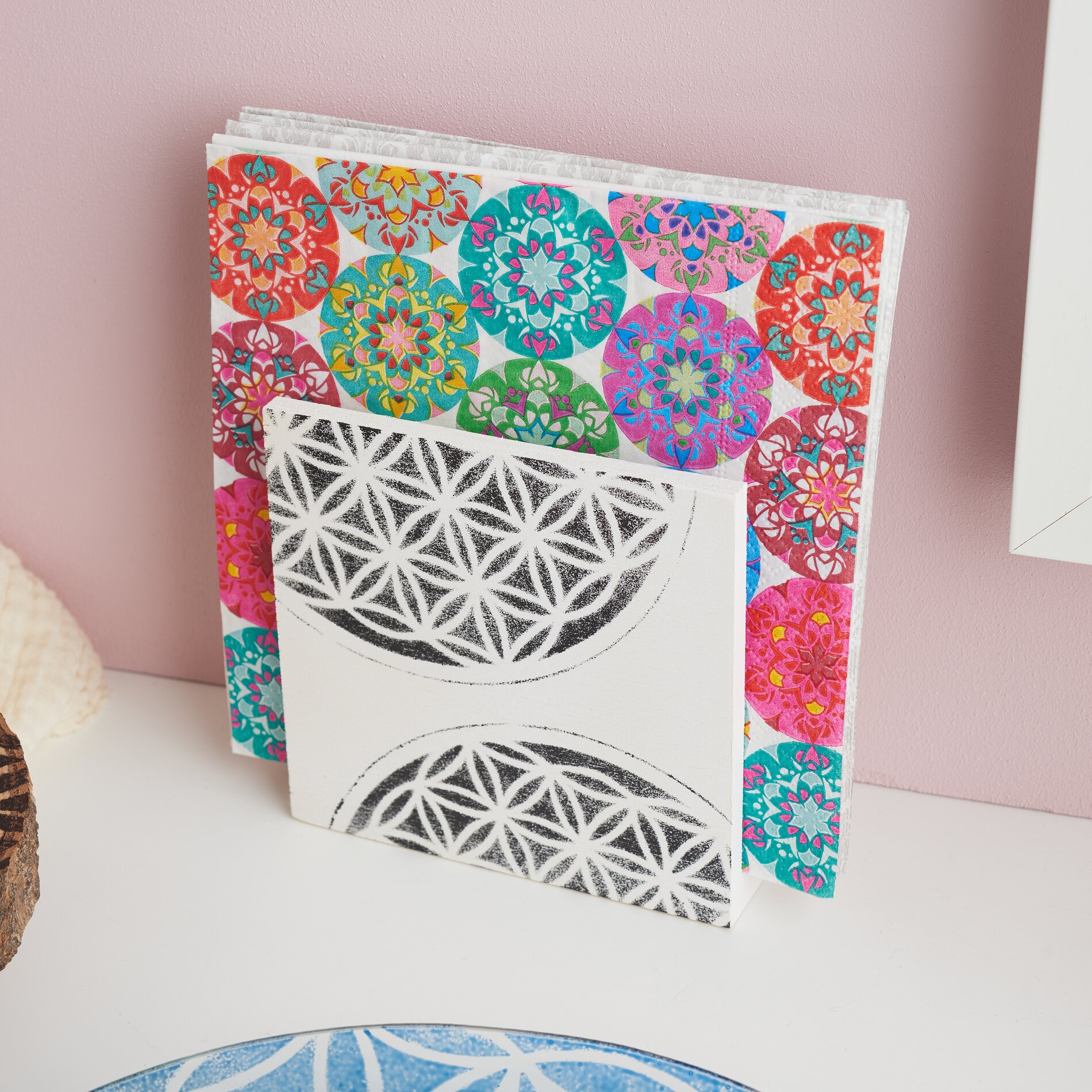 Male den VBS Serviettenhalter zuerst vollständig mit Bastelfarbe an und lasse alles gut trocknen. Danach versiehst du die Rückseite der Schablone mit Sprühkleber, platzierst sie auf den Serviettenhalter und drückst sie fest an.