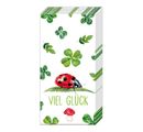 Die Papiertaschentücher "Viel Glück" von IHR sind ein Muss für jede Bastelkiste! Das Motiv zeigt einen niedlichen Marienkäfer, einen Fliegenpilz, glückbringende Kleeblätter und den motivierenden Schriftzug "Viel Glück" auf einem weißen Hintergrund. Mit diesen Papiertaschentüchern kannst du nicht nur deine Nase schnäuzen, sondern auch kleine Gegenstände mit der Serviettentechnik gestalten.