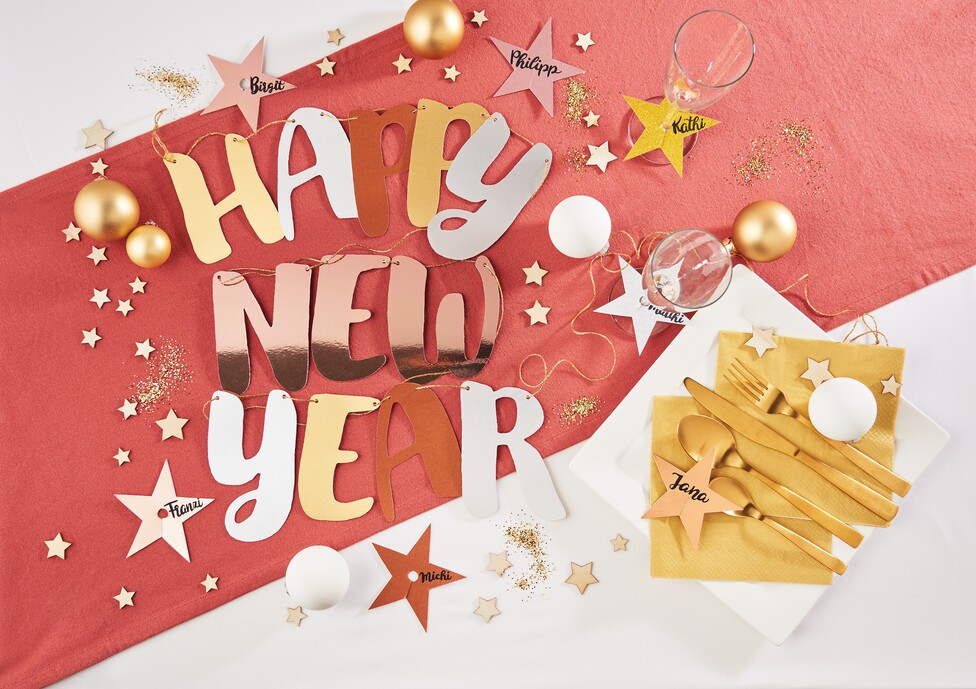 Deine glitzernde "Happy New Year"-Girlande ist bereit, aufgehängt oder auf den Tisch gelegt zu werden. Sie wird garantiert ein Highlight deiner Silvesterdekoration sein!