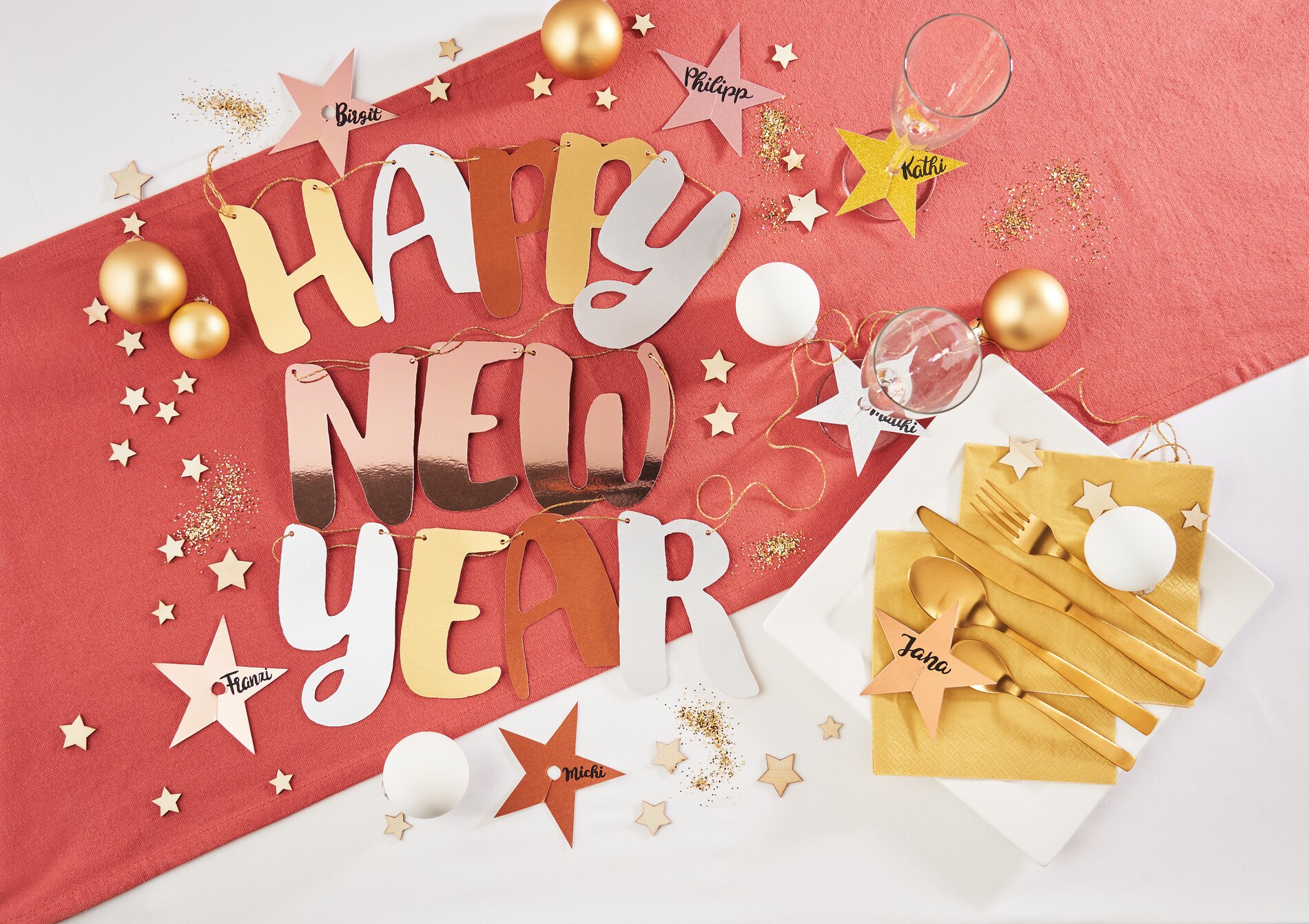 Silvester ist die perfekte Gelegenheit, um mit funkelnden Dekorationen das neue Jahr willkommen zu heißen. Mit unserer einfachen Bastelanleitung kreierst du eine stilvolle "Happy New Year"-Girlande und nützliche Glasmarkierer, die deiner Feier das gewisse Extra verleihen.