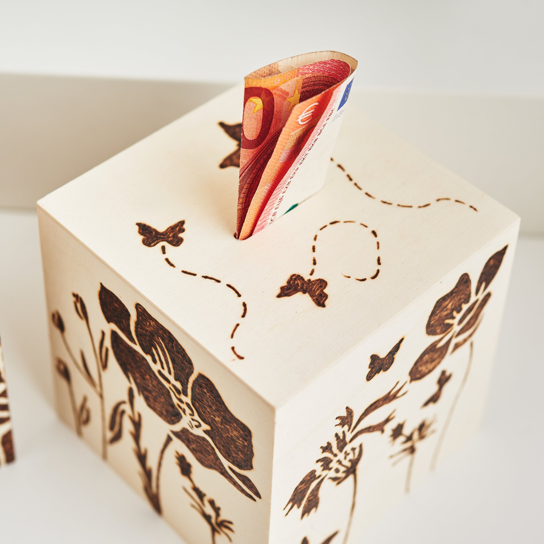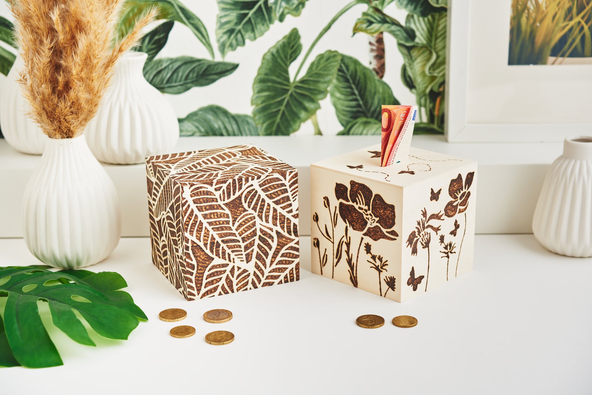 Gestalte deine eigene Holzspardose mit Brandmalerei. Entdecke passende Spardosen, Schablonen und Brandmalwerkzeuge in unserem Onlineshop und starte jetzt dein nächstes Bastelprojekt! Mach aus Holz ein persönliches Kunstwerk – wir wünschen dir viel Freude beim Gestalten!