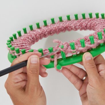 3. Jetzt startet das Abstricken der Maschen. Beginne bei dem letzten umwickelten Stift. Nimm mithilfe des Strickhakens die untere Masche und ziehe sie über die obere Masche.