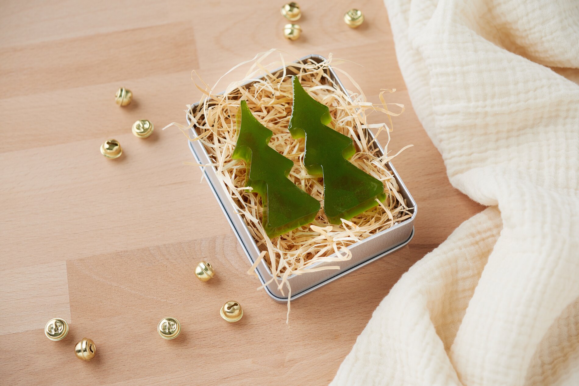Sobald die Seife fest ist, löse sie vorsichtig aus der Tannenbaum-Silikonform. Für eine besonders ansprechende Präsentation kannst du die Seife in einer Metalldose mit etwas Holzwolle platzieren. Diese hübsche Verpackung schützt die Seife und macht sie zum perfekten Weihnachtsgeschenk.