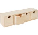 Dieses gradlinige Holzregal mit 4 Einschub-Boxen eignet sich perfekt zum Dekorieren und Gestalten. Die geraden Flächen der Schubladenbox lässt Ihnen die Möglichkeit, auch plastische Motive wie Knöpfe, Deko-Knäufe oder auch Muscheln aufzukleben. Sie können dieses Bord einzeln verwenden oder auch mit mehreren kombinieren.
