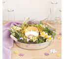 Mit einer Heißklebepistole können diverse Streuteile oder Kugeln befestigt werden. Schleifenband oder Juteband dient als Aufhängung.